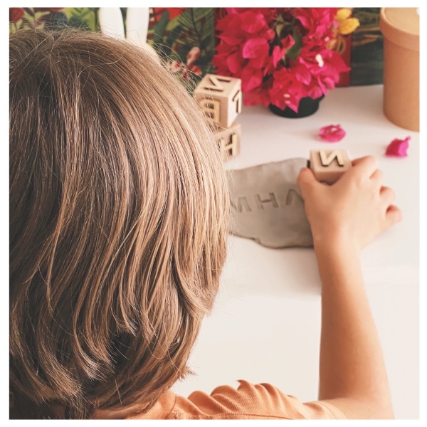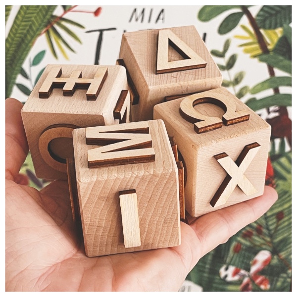 Playful learning with four wooden dice of the Greek alphabet. The dice were designed by bluberry kidsroom and are handcrafted in Metsovo.