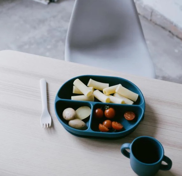 Plate with 3 compartments. Made of silicone and features a suction base for stable positioning