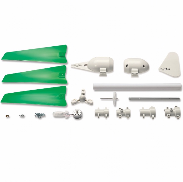CONTENTS: Part 1: Chamber x 1, Part 2: Chamber Cover x 1, Part 3: Blade x 3, Part 4: Assembled Generator and LED x 1, Part 5: Support x 1, Part 6: Tower Base x 1, Part 7: Blade Tail x 1, Part 8: Central Shaft with Rotor x 1, Part 9: Gear Wheel on Shaft x 1, Part 10: Tail Antenna x 1, Part 11: Tower x 1, Part 12: Metal Case x 2, Part 13: Screw x 17.