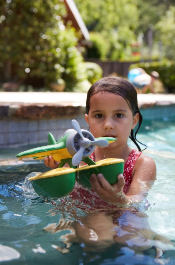Float, fly, and find Good Green Fun™ no matter how you travel. The Green Toys™ hydroplane is ready for earthly excitement in the sky or at sea. Made in the USA from 100% recycled plastic that saves energy and reduces greenhouse gas emissions, this yellow and green floating craft features a spinning propeller and oversized, buoyant floats, perfect for landing at any port. Specifically designed to float when entering the bathtub or pool, young captains can easily navigate from water to air and back again.