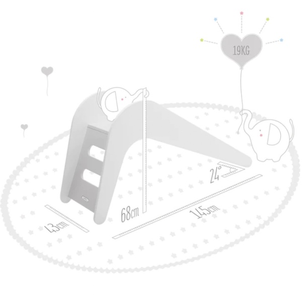 Our age recommendation for the indoor slide is 1.5 to 4 years. The slope angle is 24 degrees. This is slippery and safe at the same time.