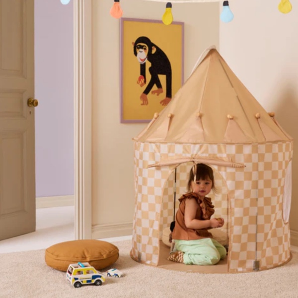 The play tent is very easy to set up and take down. Ideal for both indoor and outdoor spaces, kids will have endless hours of joy and play, entering and exiting their own “castle”! The curtain door can be rolled up to increase the play space. The tent comes with a convenient carrying case and is easy to clean.