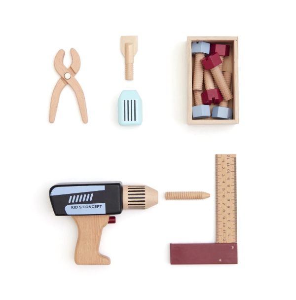 Includes: Toy tool case, Drill / Screwdriver, Bits & drill, Six toy screws, Wooden box with threads, Square, Pliers, Hand screwdriver.