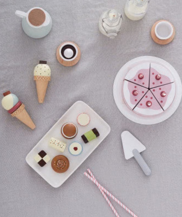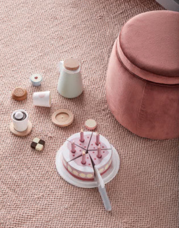 Wonderful wooden cake with candles for you to celebrate birthdays every day! The wooden cake consists of five pieces with a removable candle on each piece. The pieces are joined together with Velcro, and they can be sliced and served with the help of the included spatula.