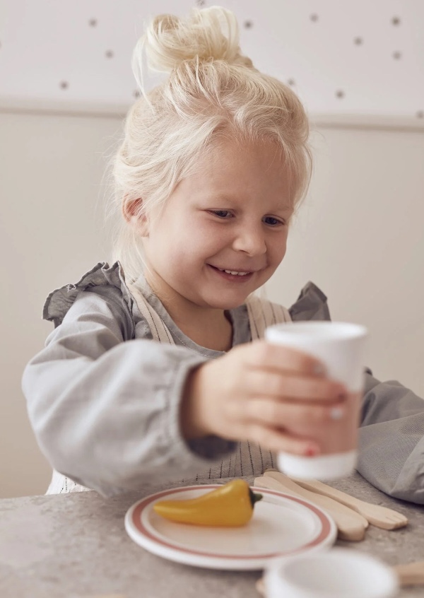 Dinner is ready! Complete wooden play-food set with 4 place settings, consisting of a total of 20 pieces.