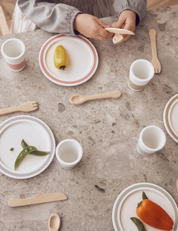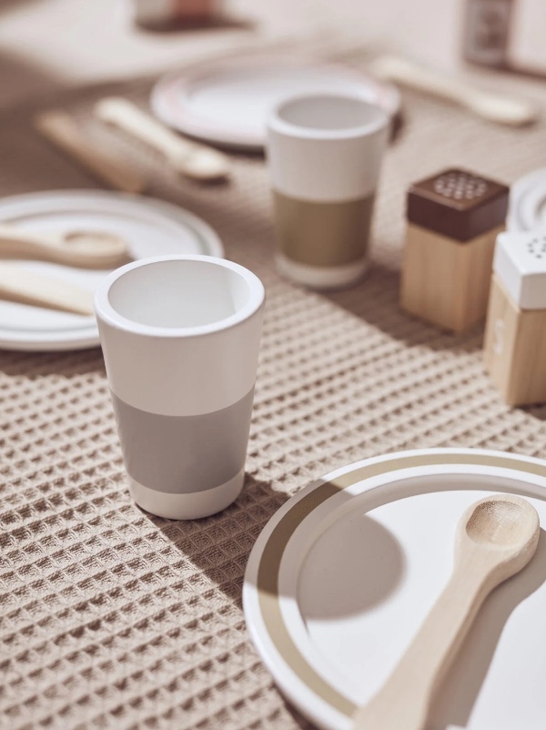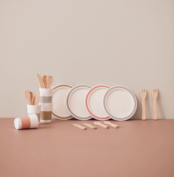 The set includes 4 wooden plates, 4 glasses, 4 knives, 4 forks, and 4 spoons - making it a great addition to any wooden kitchen.