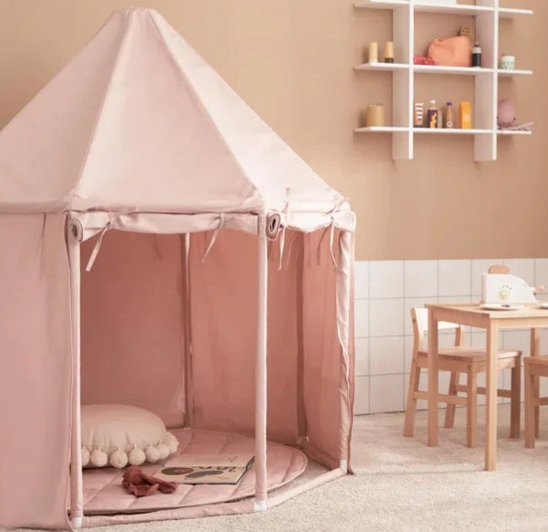 It is easy to assemble and disassemble. To make the house even cozier, match it with the foldable play mat made from the same fabric, designed to fit seamlessly inside the house. Children love to build nests and houses, creating their own little cozy and safe hideout. They can have fun for hours there, with various role-playing games. The more cushions, blankets, and toys can fit in there, the cozier the house becomes. In their imagination, their hideout can become anything - a playground, a shop, a library or just a cozy cabin. If it's a rainy day, move the house indoors to create a cozy outdoor feel inside the home.