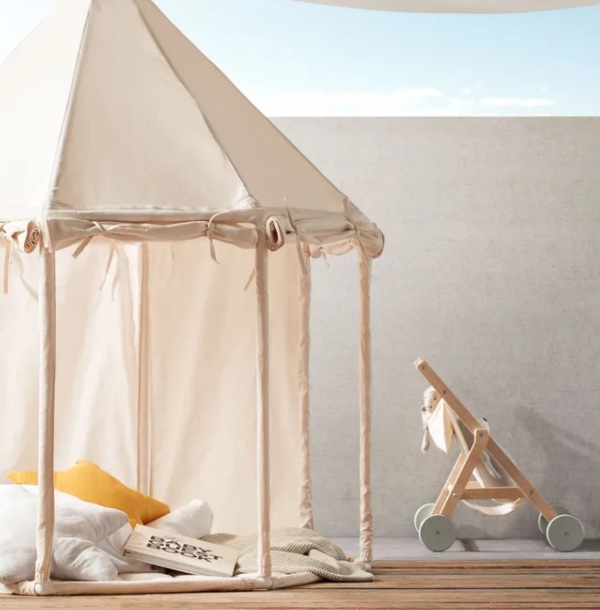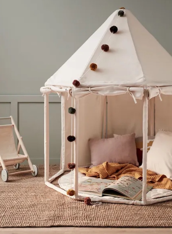 Easily assembled and disassembled. To make the playhouse even cozier, pair it with the folding play mattress made from the same fabric, designed to fit seamlessly inside the playhouse. Kids love building nests and houses and creating their little cozy and safe hideouts. They can have hours of fun there with various role-playing games. The more pillows, blankets, and toys can fit in there, the cozier the house becomes. In their imagination, their hideout can become anything - a playground, a shop, a library, or just a comfortable cabin. If it's a rainy day, move the playhouse indoors to create a cozy outdoor feel inside the house.