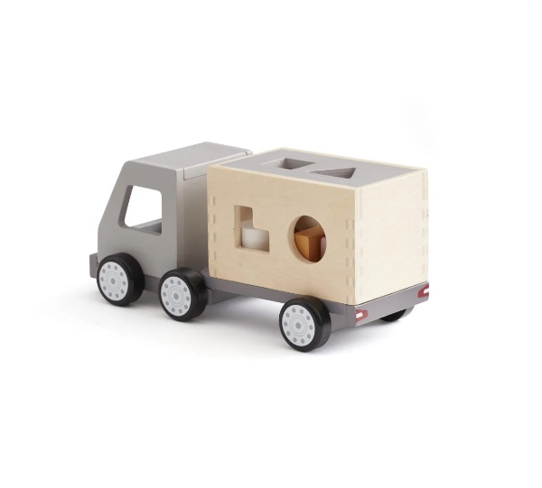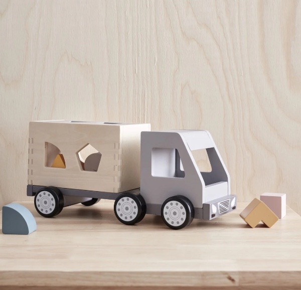 A wooden truck that serves both as a toy truck and a shape matching cube.