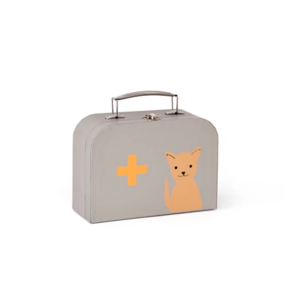 Includes an otoscope, syringe, bottle with medicine and cat food, stethoscope, thermometer, tweezers, and a fabric recovery collar.
