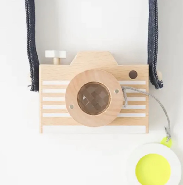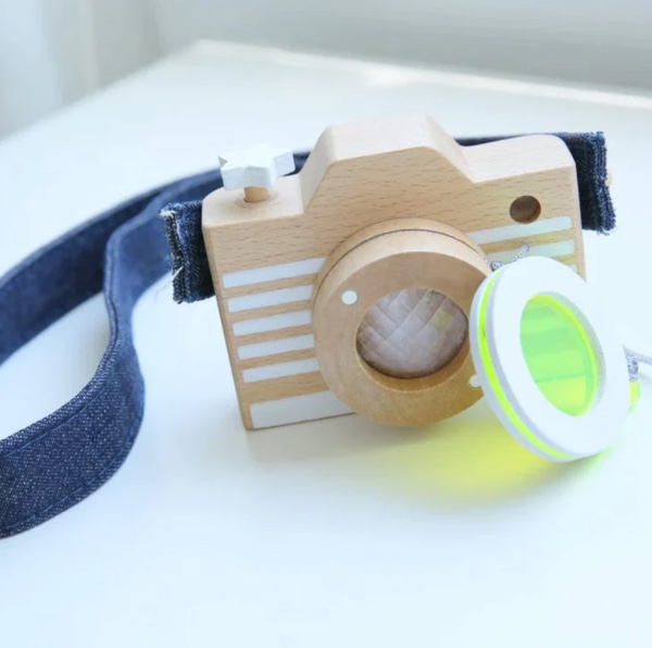 1 beech wood camera with a colored lens (acrylic, removable), two denim straps (denim, acrylic tape).