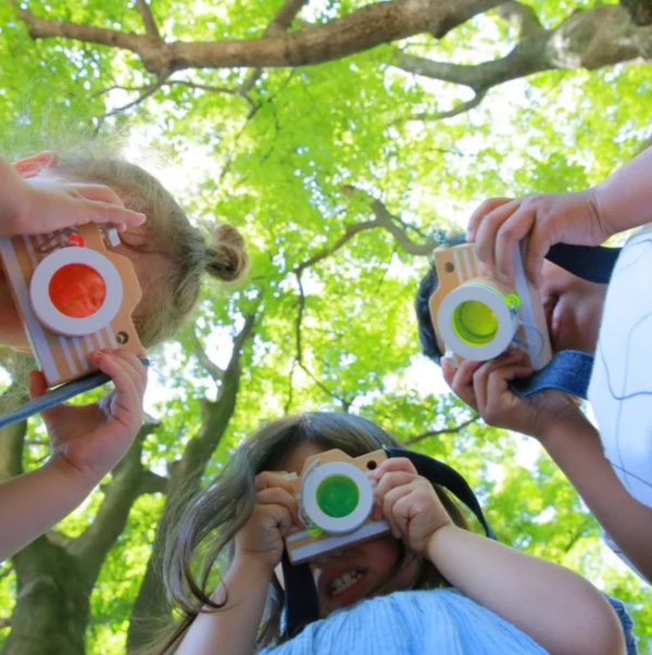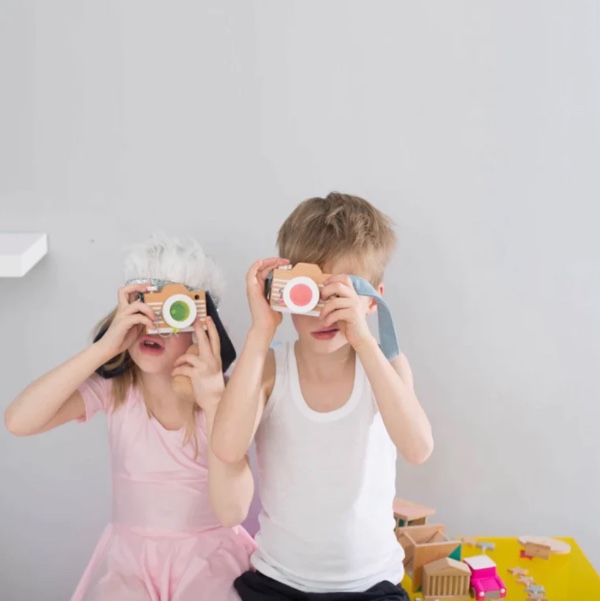 "Say cheese!!!!!!" A strange world appears as you look through the lens... Turn this world around and around... Attach a colored lens to create a new world... What can be seen through the window? Let’s choose from 2 stylish denim straps depending on the mood of the day! Little photographers can snap happily just like their families! Hang the camera around your neck and set off on a visual adventure!