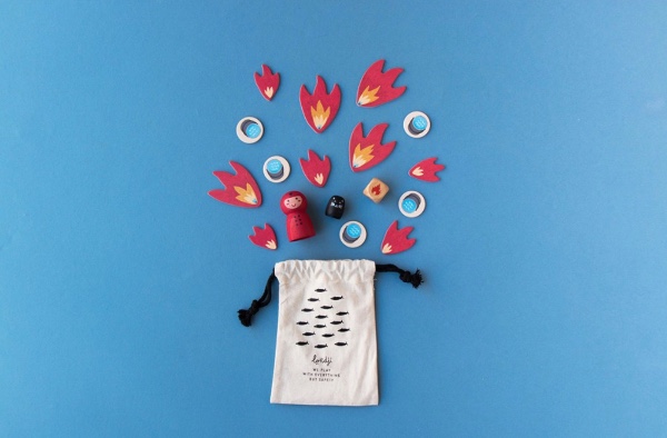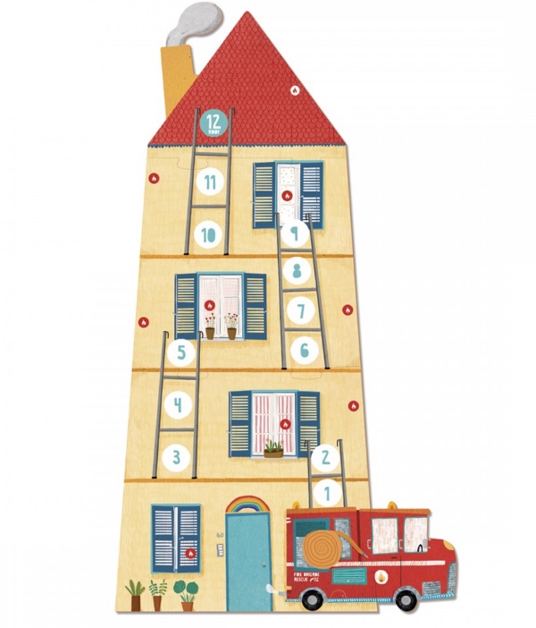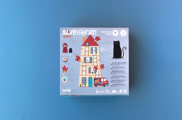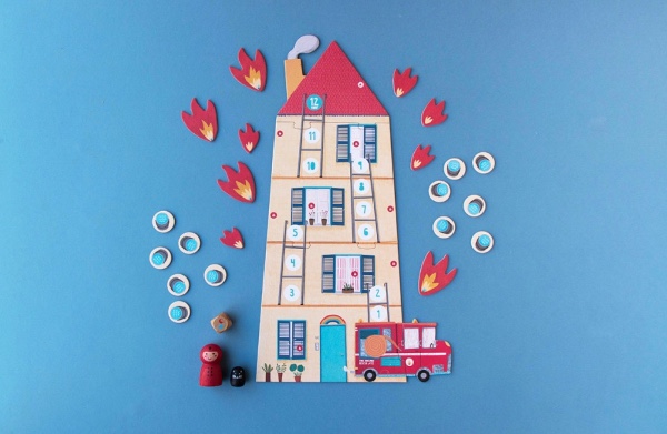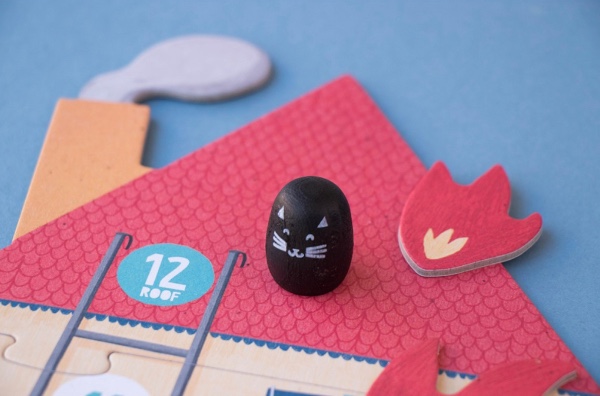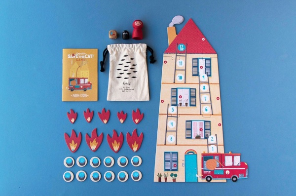 Contents: 1 wooden firefighter, 1 wooden cat, 1 wooden die, 9 fire pieces, 12 water buckets, 1 board, measuring 26 x 47 cm.