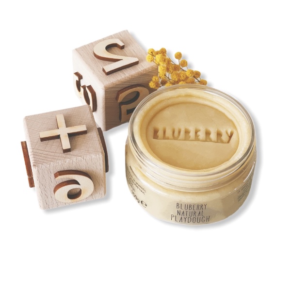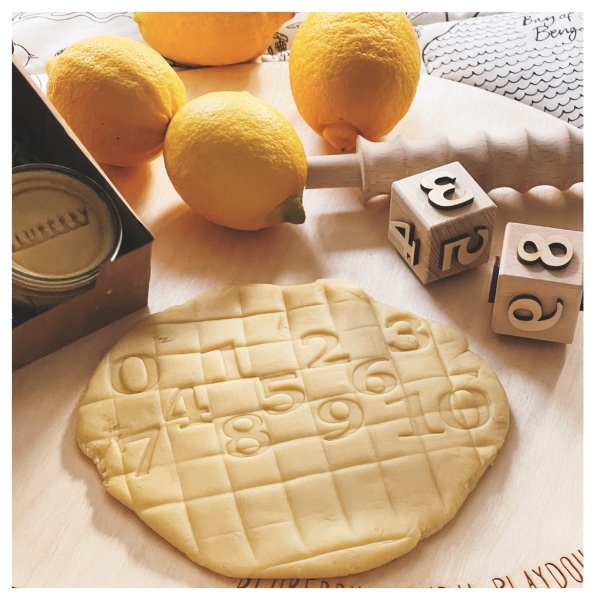 Natural play dough: 150 g lemon | Dice size: 3.5 x 3.5 cm | Material: Greek beech wood | Recommended age: +3 years.
