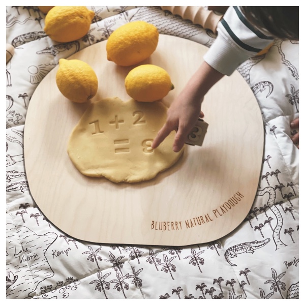 Playful learning with two wooden dice with numbers and natural play dough.