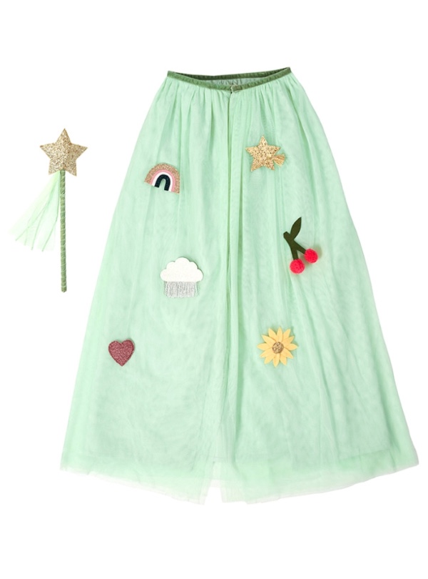 The set includes a cape and a wand. The cape is made from tulle in a soft mint color and is decorated with various icons. The wand features a golden star with glitter at the top.