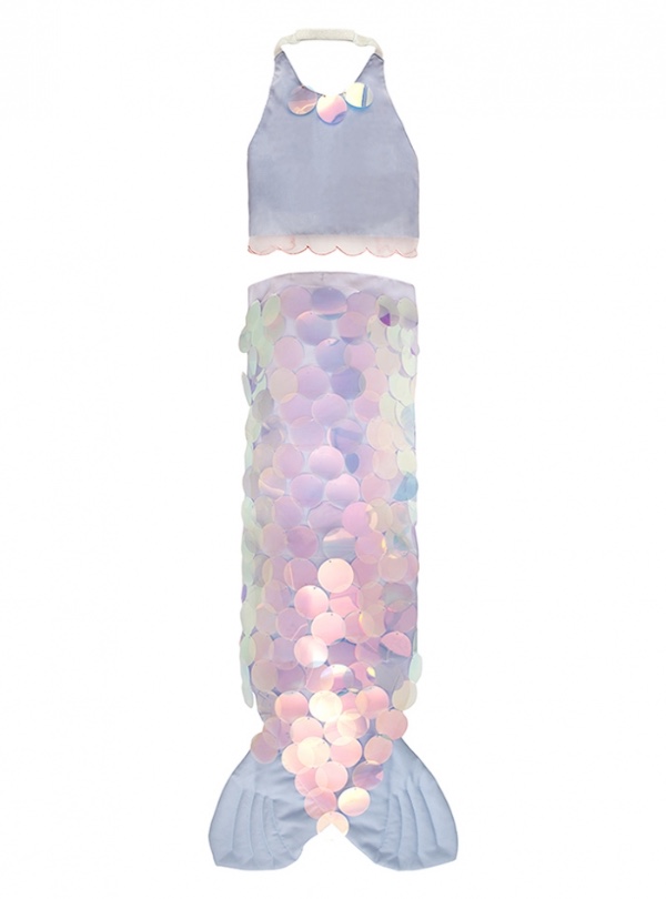 The set includes a mermaid tail and a matching blue top. The tail is decorated with iridescent sequins in pastel shades.