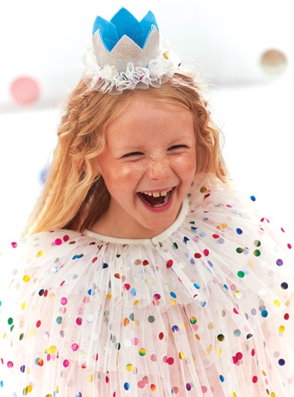 White tulle cape with colorful foil dots.