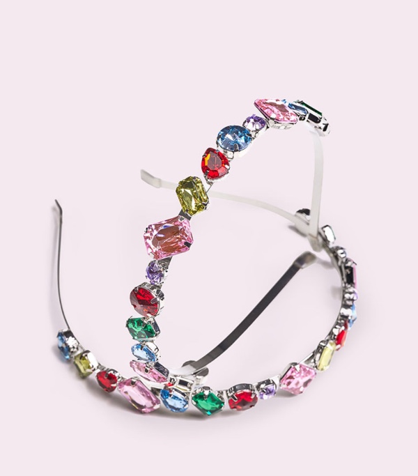 Shiny metallic headband with stones in the colors of the rainbow.