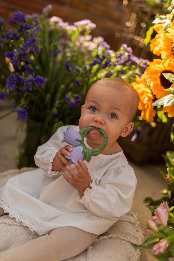 A safe teether made from natural materials and featuring an easy grip for little hands. A wide variety of textures will stimulate the baby's senses and soothe gums from teething pain.