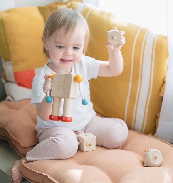This set features 4 interchangeable heads, which teach emotions and offer different tactile and auditory experiences. The arms and legs are movable to develop fine motor skills.