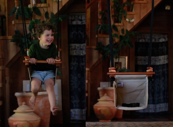 This swing is designed for both indoor and outdoor use with carabiner hooks and screw eyes for easy transition between the two. Made from natural durable wood, rot-resistant canvas, 10 mm sailing braid, and stainless steel components, the swing is well equipped to handle the elements.