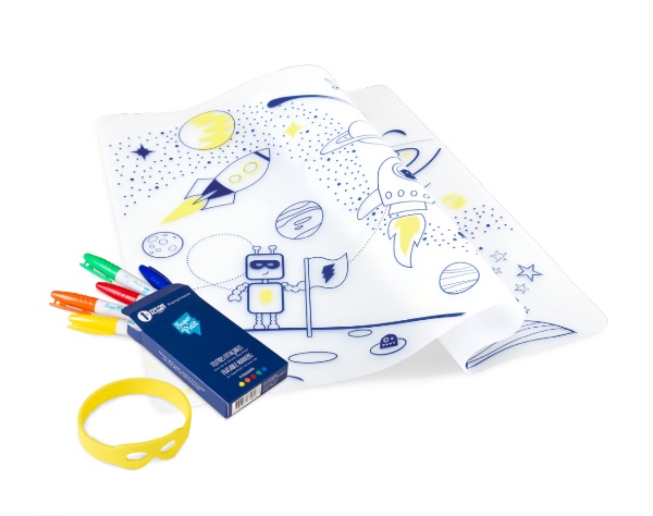 The set includes 1 silicone placemat, 5 washable markers, and 1 silicone bracelet with a SuperPetit mask, which holds the set together.