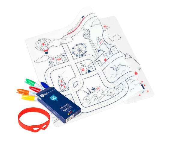 The set includes 1 silicone placemat, 5 washable markers, and 1 silicone bracelet with a SuperPetit mask, which holds the set together.