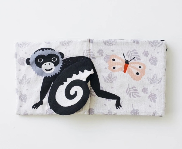 The baby will love exploring with these forest friends in the soft Peekaboo Jungle book. Each animal cover has a flap filled with crinkly paper that can be lifted to reveal a hidden illustration, all while practicing motor skills. Connect with a leopard, toucan, and monkey as they navigate the jungle, full of fun surprises, in a book that is soft and easy for babies to grasp and hold, featuring a beautiful neutral palette with high-contrast patterns that stimulate and benefit the developing vision of the baby.