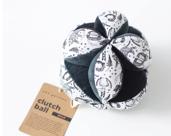 Our sensory clutch ball is designed to delight your baby's developing senses. The high-contrast hand-painted signature graphics grab the baby's visual attention, while the various textures provide tactile stimulation. The beautiful organic fabrics with shells and the jungle leaf design make it the perfect keepsake gift.
