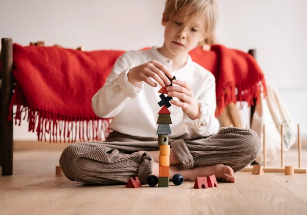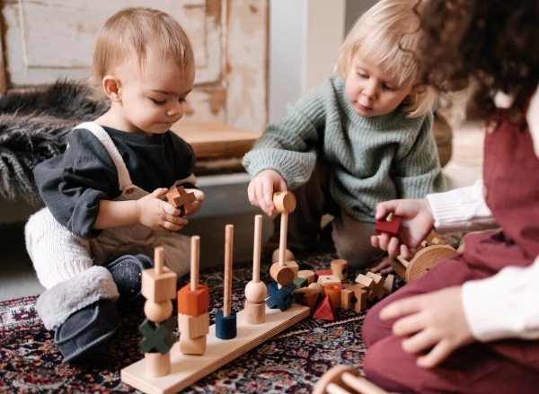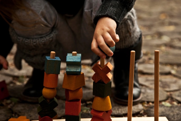 Montessori stacking toy. Can you help the figures climb up the fence? How would you like to arrange them? By colors? Shapes? Or shall we mix them up? Exercise your senses while playing!