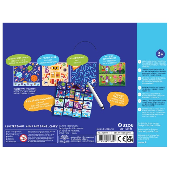 20 μοναδικά παιχνίδια με θεματολογία το διάστημα και τη διαστημική εξερεύνηση, για αμέτρητες ώρες διασκέδασης και ενασχόλησης! Οι πλαστικοποιημένες σελίδες και το στυλό που σβήνει, επιτρέπουν στα παιδιά να παίζουν ξανά και ξανά. Στη συσκευασία περιλαμβάνονται κάρτες με λαβυρίνθους, «βρες τις διαφορές», «ψάξε και βρες» και παιχνίδια με τελίτσες. Εάν γυρίσετε τις κάρτες ανάποδα, μπορείτε να συνθέσετε ένα μεγάλο παζλ.