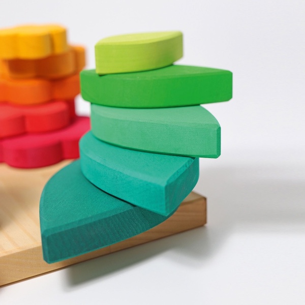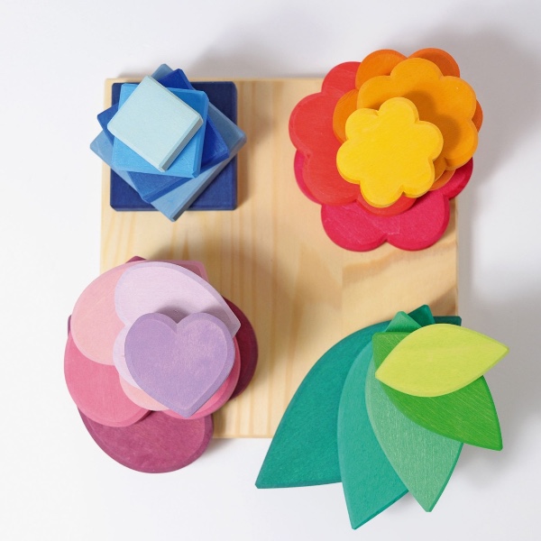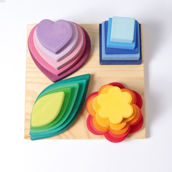 Φύλλα, λουλούδι, καρδιά και τετράγωνο: τα παιδιά μπορούν να ταξινομήσουν και να στοιβάξουν φόρμες και χρώματα και να φτιάξουν με τους δίσκους.
